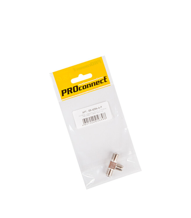 ПЕРЕХОД соединитель x3 гнезда F (F-тройник) (03-064) PROCONNECT предназначен для соединения коаксиальных проводов волновым сопротивлением 50 или 75 Ом, на концах которых расположены штекеры F-разъема. Применяется главным образом для подключения эфирного, кабельного и спутникового телевидения к телевизионному оборудованию. В частности, он позволяет разделить сигнал на две равные части и передать его на две линии при временном или предварительном подключении в период проведения ремонтно-восстановительных работ телевизионной линии. Изготовлен тройник из никелированного сплава первичной меди (биметалл), что обеспечит долговечность соединения и возможность применять его в условиях климатических перепадов. Переход соединяет кабели методом накрутки F-коннектора, после соответствующей зачистки контактов, и не требует в ходе монтажа применения каких-либо специальных инструментов.