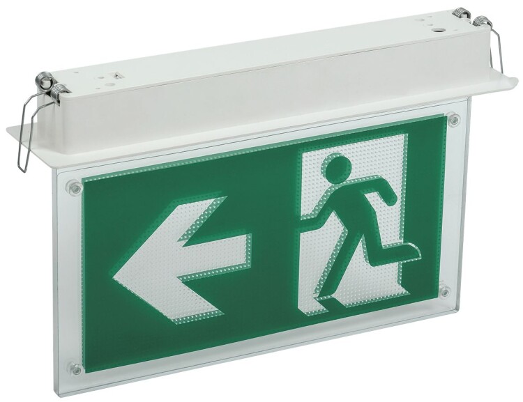 Используются для обозначения эвакуационных выходов, а также для различных информационных целей в помещениях с высоким уровнем содержания влаги и пыли. Знаки сменные. Встраивается в потолки типа Армстронг.