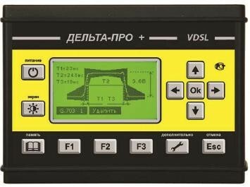 Измеритель параметров кабельных линий Дельта-ПРО+ предназначен для измерения в полевых и стационарных условиях параметров симметричных кабелей связи и проведения анализа сигналов на контрольных выходах оборудования цифровых систем передачи. Устройство представляет из себя анализатор линий VDSL, ADSL/ADSL2+, SHDSL, HDSL, E1 и рефлектометр высокого разрешения с шумоподавлением и уникально высоким перекрываемым затуханием 96 дБ. Характеристики рефлектометра: Диапазоны измеряемых расстояний (при коэффициенте укорочения 1,5): 50, 100, 200, 300, 500, 1000, 3000, 5000, 10000, 20000, 30000 м; Нижнее значение измеряемого расстояния (при коэффициенте укорочения 1,5): 0,2 м; Мертвая зона не более (при коэффициенте укорочения 1,5): 0,2 м; Пределы допускаемой погрешности определения расстояния (при коэффициенте укорочения 1,5): 0,2 м; Перекрываемое затухание: не менее 96 дБ; Частота следования калибровочных меток: 1024±0,5 кГц; Длительность зондирующего импульса: 16÷32768 нс; Выходное сопротивление: 120±6 Ом.