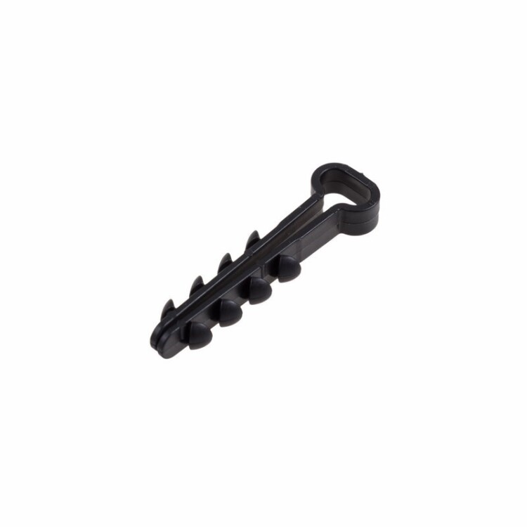 Дюбель-хомут сочетает в себе сразу два элемента — дюбель и скобу. Подходит для крепления кабеля, провода в штробу и под штукатурку. Одинаково хорошо применяется при укладке кабеля в кирпичных и блочных стенах, бетонных перекрытиях, потолках и фундаментах. Для крепления провода к стене (потолку) потребуется: - перфоратор со сверлом толщиной 6 миллиметров; - провод (кабель); - молоток; - дюбель для крепления плоского провода и кабеля. Не забывайте, что при использовании перфоратора необходимо использовать средства личной защиты: очки, наушники и перчатки. Первое, что нужно сделать — это выбрать необходимое место для прокладки провода. Далее сверлим отверстия для дюбелей на расстоянии 30-50 см друг от друга. Просверлив необходимое количество отверстий, мы берём дюбель-хомут. После чего крепим дюбелями провод к стене (потолку), для этого нам понадобится молоток: вставляем провод в дюбеля и забиваем их в отверстия. Для наилучшего сцепления дюбеля с основанием, отверстие после просверливания необходимо очистить.