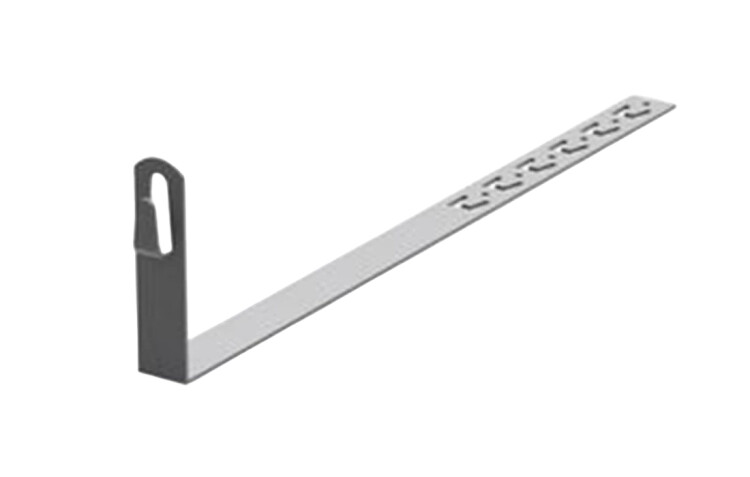 Прямой держатель под черепицу применяется для крепления молниеприемной сетки на шиферных и черепичных кровлях. Проводник фиксируется безвинтовым зажимом с помощью плоскогубцев. Длина – 330 мм, изготовлен из горячеоцинкованной стали.