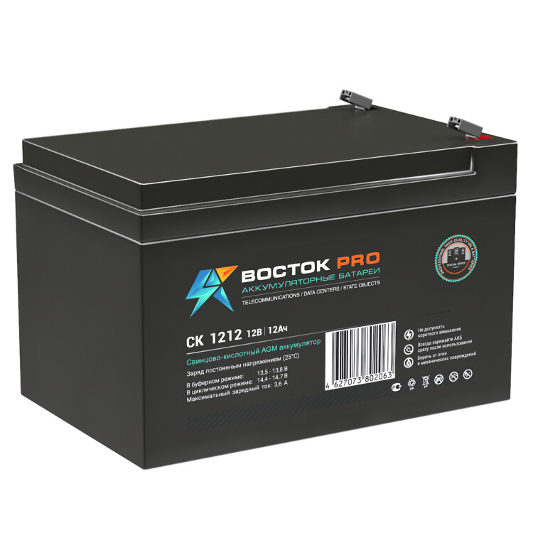 Свинцово-кислотные аккумуляторы ВОСТОК серии CK предназначены для использования в системах бесперебойного питания, резервного энергоснабжения, автономных энергосистемах. Изготовлены по AGM технологии (электролит, абсорбированный в стекловолоконном сепараторе), являются герметизированными и необслуживаемыми, со сроком службы в буферном режиме 10 лет (от 5 до 26 Ач – 5 лет). Обладают высокими разрядными и эксплуатационными характеристиками благодаря использованию в составе электролита и намазной пасты специальных добавок, препятствующих коррозии и замедляющих процесс старения.