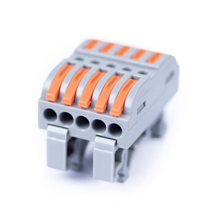 Универсальная проходная изолированная клемма с возможностью монтажа на DIN-рейку предназначена для многоразового подключения любых типов медных проводников: одножильных и многожильных. Зажим проводов в клемме осуществляется при помощи рычагов. Специальное технологическое отверстие на корпусе клеммы предназначено для проверки соединения тестером-пробником или щупом мультиметра. Элемент фиксации к DIN-рейке съемный. Клеммы обеспечивают простой и быстрый монтаж. Основные характеристики: Количество зажимов - 10, Количество линий (полюсов) - 5, Проводник - одножильный/многожильный, Материал проводника - медь, Сечение проводника - до 4,0 мм², Номинальный ток - 32 А, Максимальное напряжение - 400 В, Материал контактов - луженая медь, Материал корпуса - полиамид, Температура эксплуатации - -30°C...85°C.