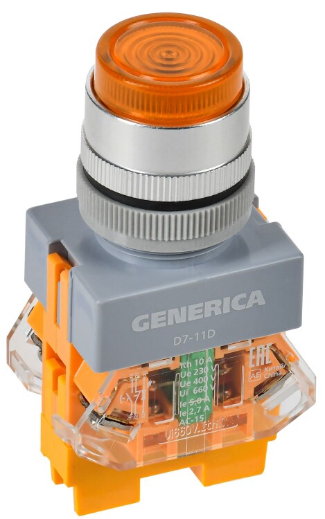 Кнопка управления D7-11D d=22мм 1NC+1NO с подсветкой желтая GENERICA