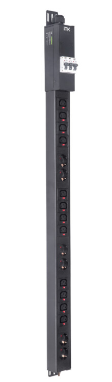 Вертикальный комбинированный блок распределения питания PDU ITK включает в себя розетки двух типов: 6 розеток Schuko и 12 розеток C13 – что позволяет подключать с их помощью различное оборудование. PDU ITK изготавливается из высококачественных термостойких материалов и пластмасс, оснащается 3-х метровым кабелем электропитания с вилкой промышленного назначения IEC60309. PDU ITK прекрасно справляется с задачей по электроснабжению сетевого оборудования в шкафах и стойках, а также с требованием защиты от токов короткого замыкания и перенапряжения. PDU ITK соответствует российским и международным стандартам качества и устанавливается с помощью кронштейнов, при этом положение кронштейнов можно менять, либо безынструментальным методом при помощи монтажных штифтов.