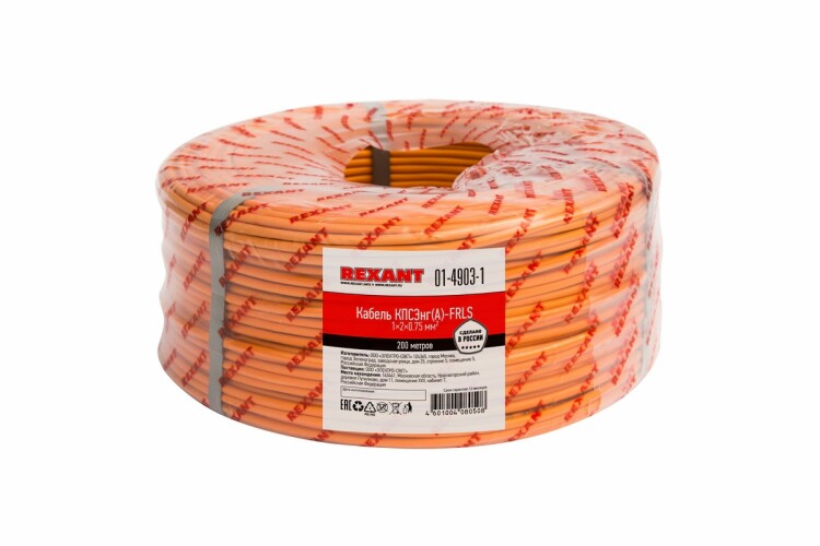 Кабель КПСЭнг(А)-FRLS 1x2x0,75 мм² REXANT симметричной парной скрутки, огнестойкий, не распространяющий горение при групповой прокладке, с пониженным дымо- и газовыделением. Кабель состоит из однопроволочного медного проводника, изоляции из огнестойкой керамизирующейся кремнийорганической резины, дренажного медного проводника, экрана из алюминиевой фольги и оболочки из ПВХ пластиката с пониженным дымо- и газовыделением. Кабель сохраняет работоспособность в условиях пожара в течение 180 минут. Номинальное напряжение тока до 300 В, частотой 50 Гц. Использование кабеля КПСЭнг(А)-FRLS 1x2x0,75 мм² REXANT регламентирует сертификат соответствия Таможенного Союза (EAC).