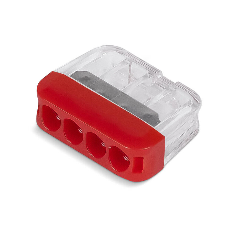Соединительная изолированная клемма предназначена для соединения одножильных медных проводников. Фиксация проводников в клемме осуществляется при помощи плоско-пружинного зажима. Специальное технологическое отверстие на корпусе клеммы предназначено для проверки соединения тестером-пробником или щупом мультиметра. Клеммы обеспечивают простой и быстрый монтаж. Основные характеристики: Количество зажимов - 4, Наличие контактной пасты - нет, Проводник - одножильный, Материал проводника - медь, Сечение проводника - до 2,5 мм², Номинальный ток - 24 А, Максимальное напряжение - 450 В, Материал контактов - луженая медь, Материал корпуса - полиамид, Температура эксплуатации: -30°C...85°C.