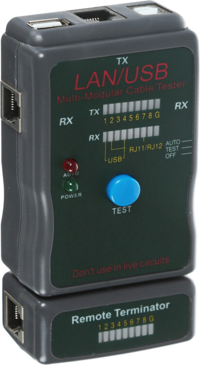 естер кабеля универсальный RJ-45 + USB 251454 REXANT применяется для тестирования витой пары и USB кабеля. Тестер состоит из двух функциональных блоков активной и пассивной части (заглушки), которые подключаются к концам кабельной линии через разъемы RJ-45 или USB. Имеет встроенную индикацию зарядки батареи питания. Светодиодная индикация есть на основном блоке прибора и на удаленном модуле, на которую выводится результат тестирования. Корпус изготовлен из ударопрочной пластмассы. Батарея: 9В Крона (6F 22) (не поставляется в комплекте)