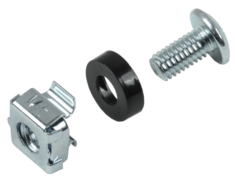 Набор винт-шайба-гайка необходим для крепления оборудования на монтажные профили шкафов и стоек. Гайки в наборе имеют квадратную форму и специальные "лапки", прочно фиксирующие их в квадратном отверстии монтажных профилей, что облегчает установку оборудования, т.к. нет необходимости держать гайку руками. Также в наборе предусмотрены платиковые шайбы, предотвращающие повреждение оборудования при затягивании винтов в гайку. Винты имеют резьбу М6. Наборы упаковываются в полиэтиленовый пакет с минимальным количеством комплектов винт-шайба-гайка в одной упаковке - 20 штук.