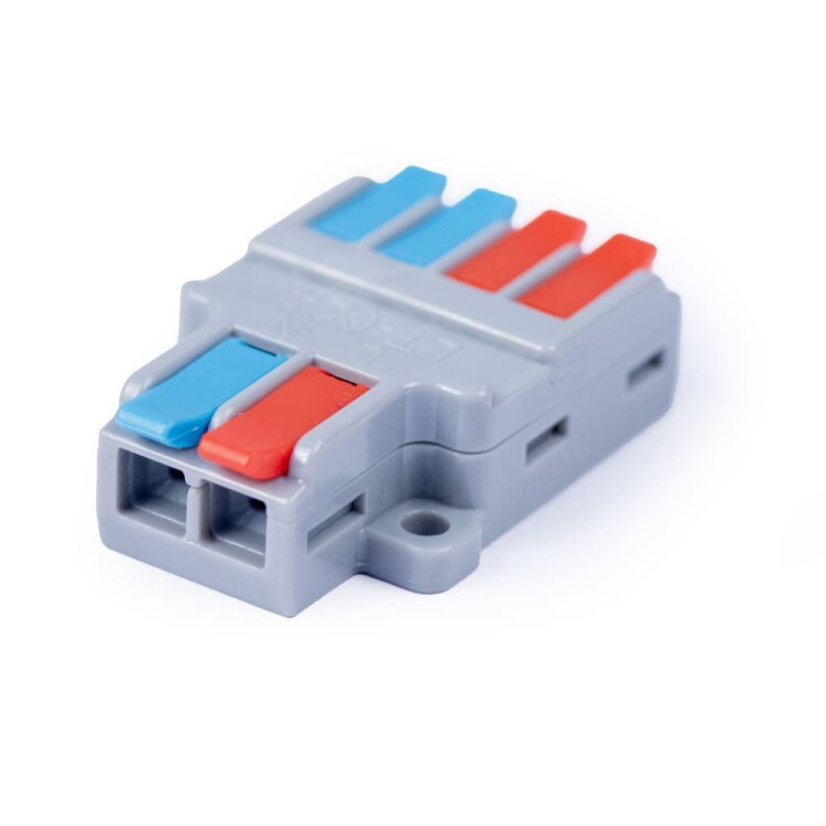 Универсальная проходная изолированная клемма предназначена для многоразового подключения любых типов медных проводников: одножильных и многожильных. Зажим проводов в клемме осуществляется при помощи рычагов. На корпусе есть боковые выступы для возможности крепления к любым поверхностям. Клеммы обеспечивают простой и быстрый монтаж. Основные характеристики: Количество зажимов - 6, Количество линий (полюсов) - 2, Проводник - одножильный/многожильный, Материал проводника - медь, Сечение проводника - до 6,0 мм², Номинальный ток - 35 А, Максимальное напряжение - 600 В, Материал контактов - луженая медь, Материал корпуса - полиамид, Температура эксплуатации: -30°C...85°C.