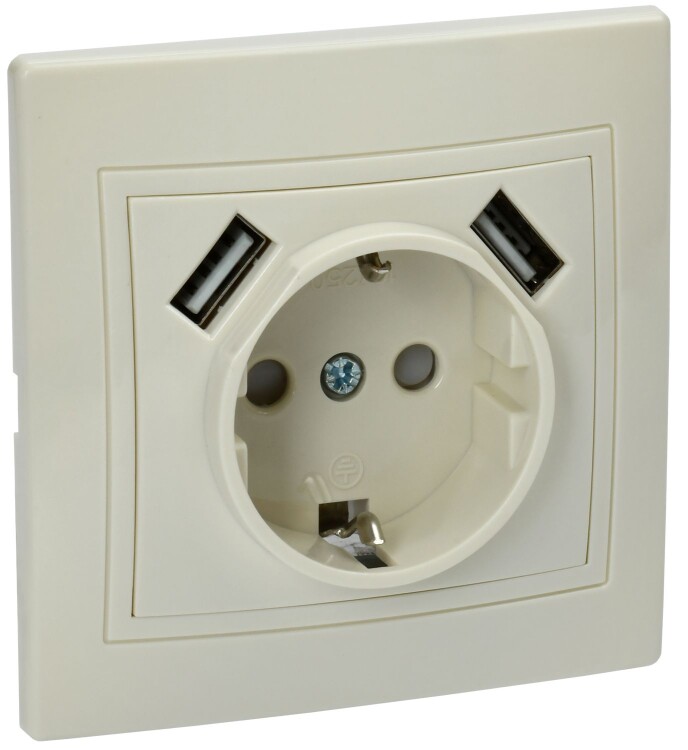 KVARTA Розетка с заземлением с защитными шторками 16А USBх2 2,1А РЮш10-1-ККм кремовый GENERICA