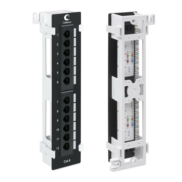 Коммутационные панели (патч-панели) предназначены для терминирования на них кабелей различных подсистем СКС и для коммутации отдельных элементов сети друг с другом при помощи коммутационных шнуров. Неэкранированная патч-панель Cabeus выполнена в формате настенного монтажа. Соответствует характеристикам категории 6. С лицевой стороны все порты пронумерованы и имеют дополнительные поля для нанесения маркировки. С тыльной стороны патч-панели размещены контакты типа Dual IDC с цветной маркировкой по двум стандартам: T568 А и B. Ножи контактов располагаются под 45°, что лучше сказывается на передаточных характеристиках разъема. Для заделки проводников подходят ножи тип 110 и Krone.