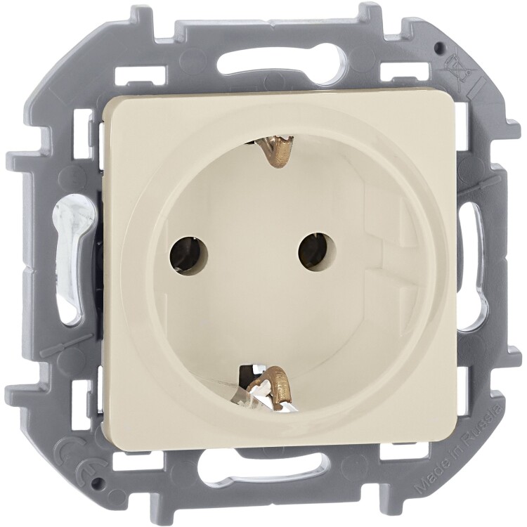 Розетка с заземлением, с защитными шторками для скрытого монтажа Inspiria, цвет "Слоновая кость", максимальный ток 16А, напряжение ~250В, максимальная мощность 3680Вт, винтовые зажимы. Применяется для присоединения однофазных электрических потребителей к сети переменного тока в зданиях с проводкой с заземлением (с защитным проводником).