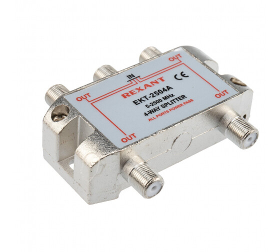 Телевизионный делитель это удобное средство для разделения сигнала на несколько равных частей. Антенные делители ,также называемые телевизионные сплиттеры часто используются, когда требуется подключить один телевизионный кабель, идущий от антенны, сразу к нескольким телевизорам или ресиверам. Особенно это актуально в многокомнатных квартирах или многокомнатных загородных домах. Делитель имеет один вход под F разъем и четыре выхода, также под F разъемы. Сигнал, подающийся на вход делителя, делится на две равные части и передается на выходы. Для подключения кабелей используются стандартные F-разъемы. Полоса пропускания делителя от 5 до 2500МГц позволяет использовать его в системах спутникового телевидения. Качественно изготовленный ТВ сплиттер REXANT долго и надежно прослужит в составе телевизионной системы, делая удобной эксплуатацию нескольких телевизоров.