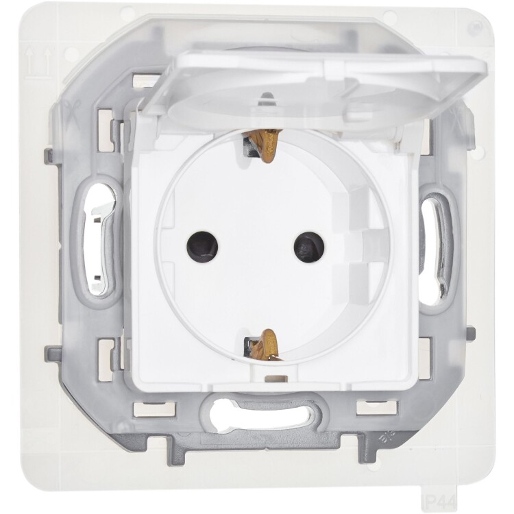 Розетка с заземлением, защитной крышкой и интегрированными защитными шторками для скрытого монтажа Inspiria, степень пылевлагозащиты IP44, цвет "Белый", номинальный ток 16А, напряжение ~250В, максимальная мощность 3680 Вт, винтовые зажимы. Применяется для присоединения однофазных электрических потребителей к сети переменного тока в зданиях с проводкой с заземлением (с защитным проводником). Предназначена для установки в местах с повышенной влажностью. Оснащена интегрированными шторками, которые защищают детей и других пользователей от удара электрическим током.