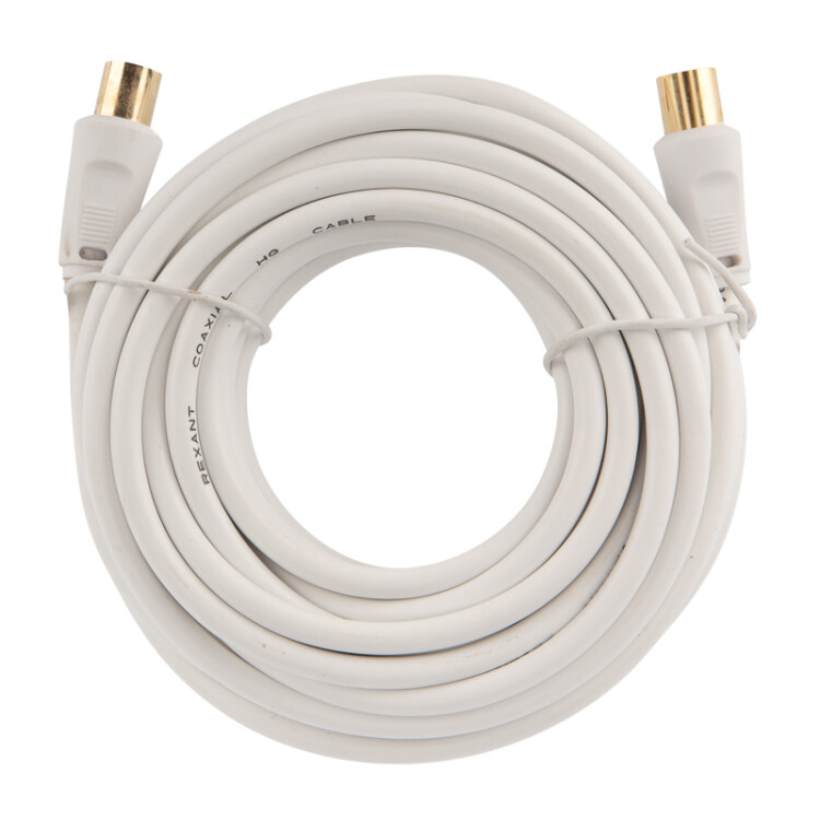 Шнур TV PLUG - TV JACK 7 м белый REXANT предназначен для передачи аналоговых аудио- и видеосигнала телевизионной сети к телевизору при подключении к телевизионной розетке, для подключения различного телекоммуникационного оборудования (ресиверы, ТВ-приставки и т. д.). Его также можно используют в качестве удлинителя высокочастотного кабеля для передачи ТВ сигнала от телевизионной антенны. C одной стороны шнура располагается штекер TV разъема, с другой — гнездо TV разъема. Корпус разъемов выполнен из качественного, легкого и прочного пластика. Контакты никелированы и обеспечивают высокий уровень передачи сигнала к оборудованию. Цвет шнура белый, длина составляет 7 метров. Профессиональный уровень надежности достигается благодаря применению качественных материалов и высокотехнологичного уровня исполнения шнура.