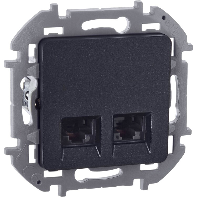 Розетка компьютерная двойная для скрытого монтажа Inspiria, 2 разъема RJ45 категория 6 UTP, цвет "Антрацит". Предназначена для быстрого подключения персональных компьютеров, принтеров, роутеров и другого оборудования к информационным сетям категории 6 со скоростью передачи данных 1 Гб/сек. Подходит для использования в сетях категории 5е. Возможно прямое подключение 2 устройств и 2 кабелей.