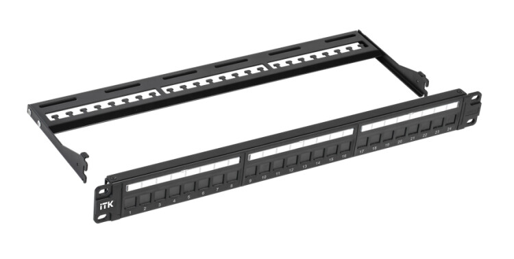 Коммутационные панели или патч-панели являются важнейшей частью любой СКС и IT-инфраструктуры здания и сооружения с большим количеством информационных розеток и терминальных портов конечных пользователей, которые необходимо коммутировать на порты активного сетевого оборудования, размещенного в серверных и распределительных узлах. В зависимости от способа крепления, масштабности кабельной системы, типа сети ITK изготавливает патч-панели для настенного монтажа или монтажа в 19-дюймовый конструктив, по количеству портов: 12-, 24-, 25-, 48-, 50-, категорий: 3 (телефонные), 5E, 6, 6A, в экранированном исполнении и без защитного экрана. Патч-панели для монтажа в 19" шкаф или стойку соответствуют стандарту 19", имеют отверстия с левой и правой стороны для крепления на профиль, производятся высотой 0,5, 1 или 2 юнита. На передней стороне все патч-панели ITK имеют специальную площадку для дополнительной маркировки и цифровую нумерацию портов, на обратной стороне модули IDC имеют цветовую и цифровую нумерацию.