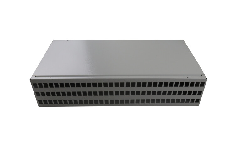 Шкаф устанавливается в 19-дюймовые телекоммуникационные стойки, рассчитан на 96 SC портов, занимает 2U. Передняя панель несъемная. Размеры 405х230х88мм, вес 5,5 кг. Внутрь кросса помещаются сплайс-кассеты СКУ-4 либо СКУ-1
