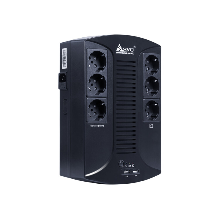 Линейно-Интерактивный ИБП с функцией сетевого фильтра SVC U-650-L. Устройство, позволяющее подключённому оборудованию некоторое время работать от встроенных аккумуляторов, при пропадании электрического тока или при выходе его параметров за допустимые нормы. 3 выходных разъёмов Shuko CEE7 с батарейной поддержкой и 3 выходных разъёмов с функцией сетевого фильтра позволят подключить большое количество оборудования. 2*USB порта 5В/2А позволят зарядить любое портативное устройство.