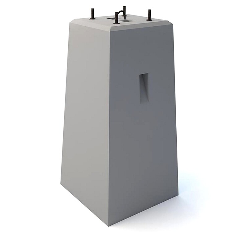 Фундамент светофора ФС 150.77А для опор контактной сети, типовой проект №15379-00-01. Фундамент применяется для анкерной установки металлических светофорных мачт. Особенности конструкции Конструкция имеет следующие габариты: 1500х770х770 мм. Установочное расстояние между закладными анкерными болтами для крепления стойки светофора составляет 300х300 мм, диаметр болтов М24 мм. В качестве материала используется бетон класса В30 морозостойкость F200 водонепроницаемость W6. Фундамент выдерживает нагрузку + тс*м.
