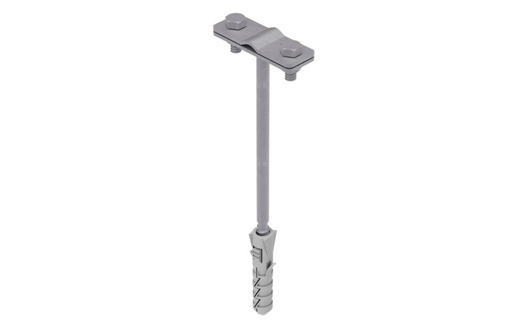 Фасадный держатель применяется для крепления круглых (8-10 мм) и плоских (25-40 мм) токоотводов по фасаду здания. Способ крепления проводника - болтовой зажим. Длина – 160 мм, изготовлен из горячеоцинкованной стали.