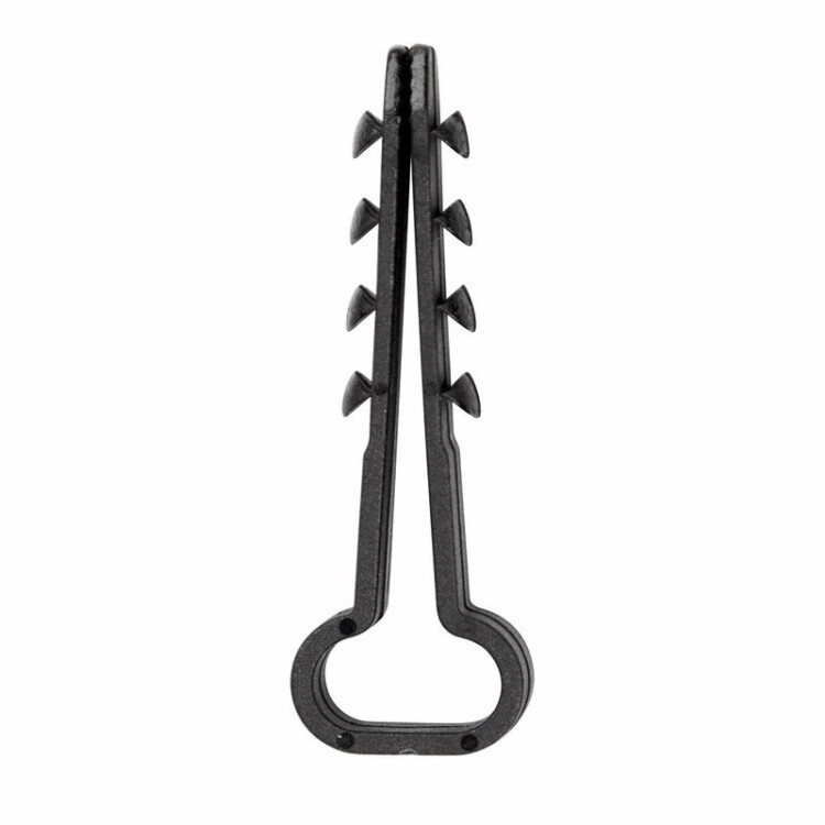 Дюбель-хомут сочетает в себе сразу два элемента — дюбель и скобу. Подходит для крепления кабеля, провода в штробу и под штукатурку. Одинаково хорошо применяется при укладке кабеля в кирпичных и блочных стенах, бетонных перекрытиях, потолках и фундаментах.