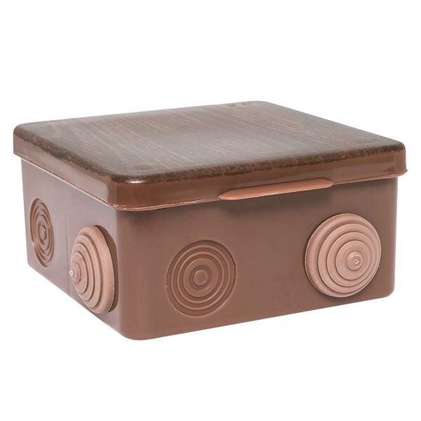 Распределительная коробка КМР-030-014 с крышкой (100×100×55 мм), 8 мембранных вводов, цвет «тёмное дерево», степень защиты IP54, бренд EKF — это монтажное изделие для организации электрических сетей. Она предназначена для защиты соединений жил кабелей от пыли, влаги и механических повреждений.