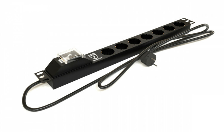 Hyperline SHE19-7SH-BF-2.5EU Блок розеток для 19" шкафов, горизонтальный, 7 розеток Schuko, автомат. выключатель, защита от перенапряжения, кабель питания 2.5м (3х1.5мм2) с вилкой Schuko 16A, 250В, 482.6x44.4x44.4мм (ШхГхВ), корпус алюминий, черный