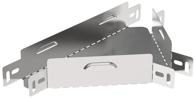 Разветвитель Т-образный горизонтальный предназначен для организации Т-образного ответвления кабельной трассы в горизонтальной плоскости. Аксессуар поставляется в плоском виде, имеет направляющую перфорацию для сгиба и сборки изделия перед установкой. Стыковка аксессуара с лотком осуществляется за счёт телескопического соединителя. Подходит для всех типов листовых лотков серии ESCA. Крышка на аксессуар заказывается отдельно. Аксессуар изготовлен из стали оцинкованной методом Сендзимира (защитный слой цинка не менее 5-10 мкм).