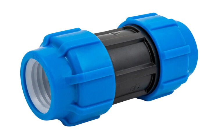 Предназначена для соединения полиэтиленовых труб соответствующего диаметра механическим способом. С ее помощью соединяют трубопроводы для водоснабжения, сельскохозяйственного орошения, отопления, технических систем подачи воды и т.д. Компрессионная муфта представляет собой комбинированное изделие из полиэтилена и резины (вид изделия может отличаться от представленного без потери его функциональных и технических свойств). Она состоит: - из внутреннего соединительного элемента или торцевой цанги с нарезанной на ней наружной резьбой; - упорных колец и ограничителей; - уплотнительных колец; - наружных гаек. Для соединения двух полиэтиленовых труб используют цангу. Она представляет собой короткий металлический или полиэтиленовый отрезок с прорезанной на двух сторонах резьбой. Торцы цанги позволяют частично зафиксировать в них концы подсоединяемых труб. На трубы надевают упорные кольца, уплотнители и ограничители. Уплотнители не дают воде вырываться наружу и, в общем, существенно улучшают общую герметичность. Упорн