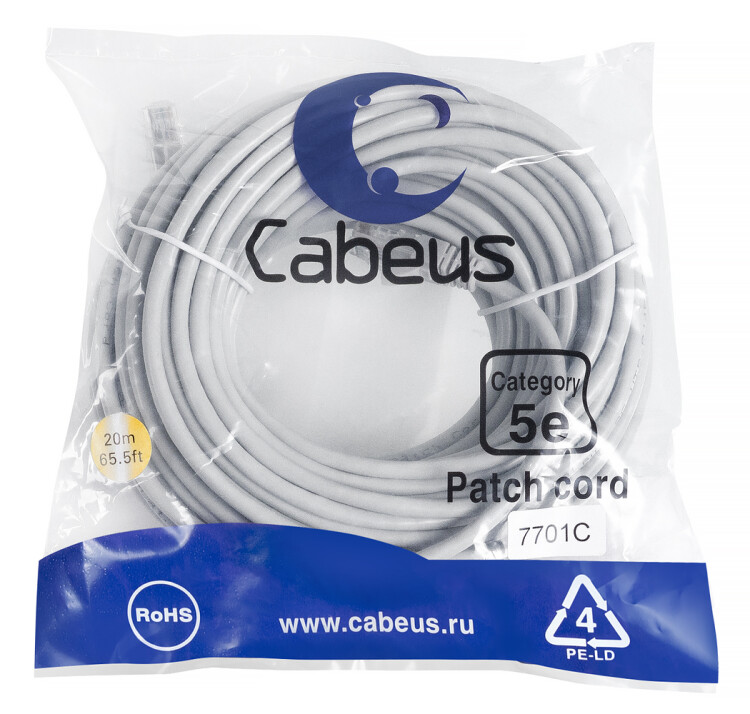 Патч-корд 4 пары, 2хRJ45, 20м, Кат.5e, UTP, серый, PVC, Cabeus PC-UTP-RJ45-Cat.5e-20m