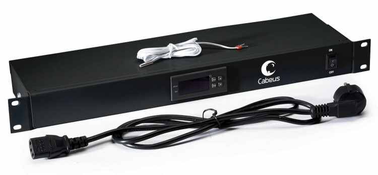 Микропроцессорная контрольная панель предназначена для подключения 2-х вентиляторов и поддержания температуры в телекоммуникационном шкафу на заданном уровне. Состоит из стального корпуса с кронштейнами для крепления на направляющих 19” шкафов. С лицевой стороны имеется кнопка включения/выключения панели и терморегулятор. С задней стороны имеется разъем IEC-60320 C14 для подключения шнура питания панели, разъем для подключения температурного датчика и 2 разъема IEC-60320 C13 для подключения вентиляторов. Питание модуля осуществляется подключением его к сети напряжением 220В с помощью шнура из комплекта поставки Schuko CEE 7/7-С13, длиной 1,5 м. Покрытие корпуса выполнено ударопрочной порошковой краской черного цвета RAL 9004.