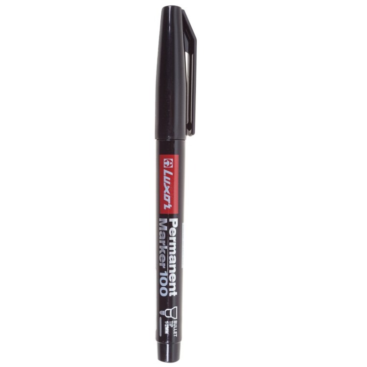 Маркер перманентный Luxor «100» на спиртовой основе. Используется для письма на изделиях из: бумаги, пластика, металла, стекла, резины, кожи, ткани. Не смазывается, не разбрызгивается и не растекается при нанесении Чернила содержат высокую концентрацию пигмента, что позволяет им хорошо ложиться на гладкие и шероховатые поверхности. Обладают свето-, влаго- и термостойкостью Пулевидная форма наконечника не оставляет царапин при письме. Чернила высыхают на поверхности в течение нескольких секунд. Корпус изделия выполнен из прочного ABS-пластика. Перед началом использования необходимо встряхнуть маркер.