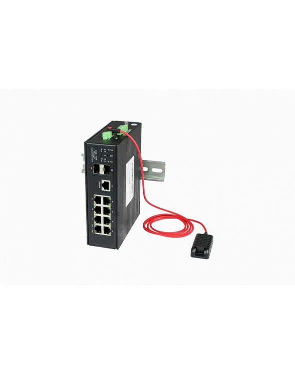 Промышленный управляемый (L2+) коммутатор Gigabit Ethernet на 8GE RJ45 + 2 GE SFP порта с функцией мониторинга температуры/ влажности/ напряжения. Порты: 8 x GE (10/100/1000Base-T) + 2 x GE SFP (1000Base-X). Уровень управления L2+. Встроенная система мониторинга температуры/ напряжения + внешний датчик температуры/ влажности. Выходы типа "Сухой контакт", Цифровой вход. Поддержка режима увеличения расстояния передачи данных до 250м. Встроенная грозозащита 6кВ. Питание: 2 x входа DC12-57V(15W). БП в комплект НЕ входит. Монтаж на DIN-рейку или на стену (крепление в комплекте). Размеры (ШхВхГ): 50х162х130мм. Вес: 1,1кг. Рабочая температура: -40…+80°С.