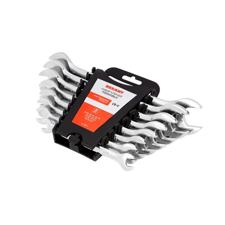 Набор рожковых гаечных ключей REXANT предназначен для монтажа и демонтажа резьбовых соединений: болтов, гаек, муфт и т. д. Хромованадиевый сплав, из которого изготовлены ключи, обладает такими свойствами, как прочность, жесткость, устойчивость к износу. Инструменты обладают высокой устойчивостью к коррозии благодаря хромовому покрытию. Просты в обращении и обеспечивают доступ к любому крепежу. Размеры: 8х10, 10х12, 12х13, 14х15, 13х17, 17х19, 19х22, 22х24 мм. Ключи поставляются в пластиковом футляре для удобного хранения и транспортировки.