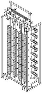 Кросс-стойка двустороннего обслуживания под плинты 2/10 общей емкостью 4800 пар КСДО-4-ХМ-2400/2400 применяется для кроссировки медных абонентских и станционных линий АТС средней и большой ёмкости. Оснащена монтажными хомутами для плинтов LSA PLUS. Кроссовая стойка выполнена по традиционной схеме расположения линейной (вертикальные ряды) и станционной (горизонтальные ряды) сторон и рассчитана на установку 10-парных плинтов на линейной стороне и станционной стороне.