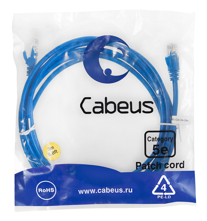 Патч-корд 4 пары, 2хRJ45, 3м, Кат.5e, UTP, синий, LSZH, Cabeus PC-UTP-RJ45-Cat.5e-3m-BL-LSZH