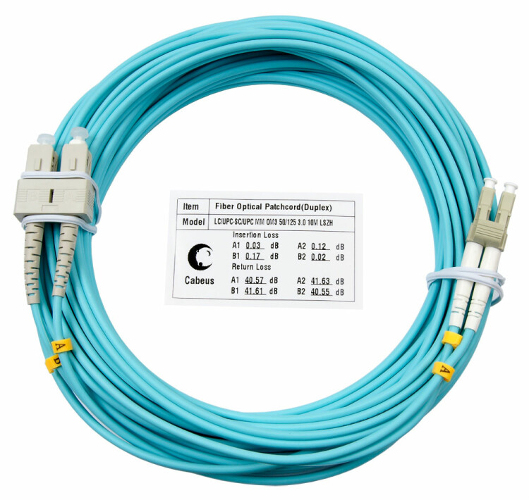 Шнур оптический LC/UPC-SC/UPC, МM, 50/125, OM3, 20м, Duplex, бирюз., Cabeus FOP-50-LC-SC-20m