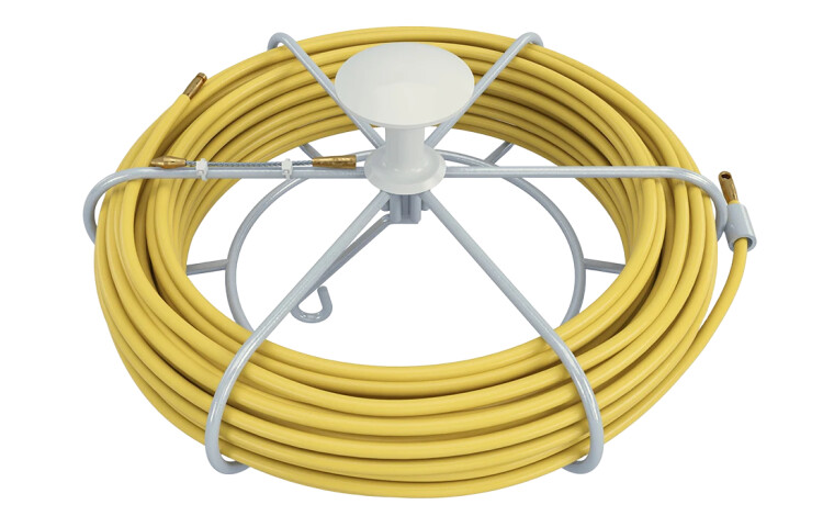 Предназначено для протяжки кабеля различного назначения в трубах, металлоруковах, закрытых коробах и других видах кабельных каналов зданий. Представляет собой металлическую кассету-основание в которую помещен стеклопластиковый пруток диаметром 6 мм с защитным покрытием из полиэтилена высокой плотности. Один конец прутка оконцован латунным наконечником с резьбой, на котором размещается коуш или может быть установлена сменная лидер-насадка (идет в комплекте). Второй конец имеет несъемный наконечник в виде коуша. Оконцовка стеклопрутков наконечниками дополнительно сопровождается их склейкой клеем ВК-9 производства ССД. За счет этого достигается наивысшая прочность фиксации наконечников. Кассета-основание изготовлена из металлических элементов покрытых порошковой эмалью. Состоит из стойки и барабана. Стойка изготовлена из трубы, концы которой заглушены пластиковыми пробками для предотвращения попадания воды и грязи. Стойка имеет устойчивое основание и вертикальную часть, к которой приварена ось для размещения на