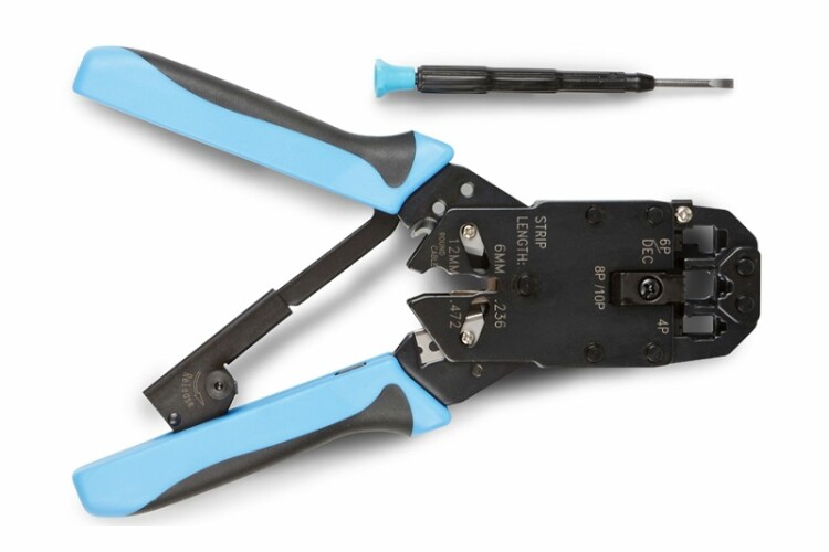 Hyperline HT-2008AR Инструмент обжимной (кримпер) для RJ-45, RJ-12, RJ-11 (8P8C, 6P6C, 4P4C), с храповым механизмом и комплектом сменных лезвий. Назначение: Обжим экранированных и неэкранированных разъемов 8P8C/RJ45, 6P6C/RJ12, 6P4C/RJ11, 6P6C DEC offset, 4P4C/4P2C Снятие изоляции с плоских телефонных проводов Снятие оболочки с круглых проводов типа UTP, STP. Особенности: Рабочая голова оснащена прецизионными обжимными матрицами с параллельным обжимом, что гарантирует точный и ровный результат заделки Материал корпуса - качественная углеродистая сталь с воронением. Обеспечивает продолжительную тяжелонагруженную работу Двухкомпонентные рукоятки обеспечивают уверенный захват и удобную продолжительную работу без усталости Встроенный инструмент для зачистки круглых/плоских кабелей и кусачки для подготовки кабеля Направляющая для зачистки плоского кабеля 1/2" и 1/4" без предварительной разметки