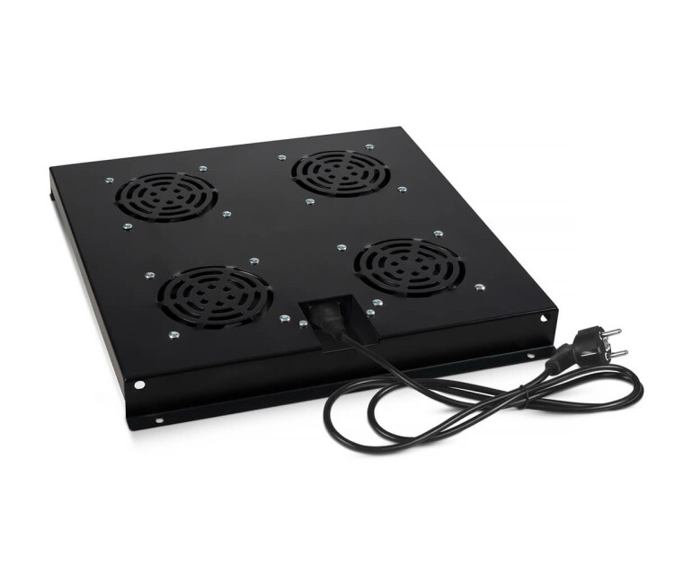Модуль вентиляторный потолочный предназначен для охлаждения внутренней части телекоммуникационного шкафа путем отвода тепла наружу. Модель предназначена для установки в серверные шкафы Cabeus серии ND-SC глубиной 1200мм. Вентиляторный модуль состоит из металлического конструктива с закрепленными на нем 4-мя вентиляторами. Питание модуля осуществляется подключением его к сети напряжением 220В с помощью шнура питания IEC 320 C13/Schuko длиной 1,5 м. Покрытие вентиляторного модуля – порошковая краска черная (RAL9004). Установка модуля производится путем крепления с внутренней стороны шкафа к верхней его части.