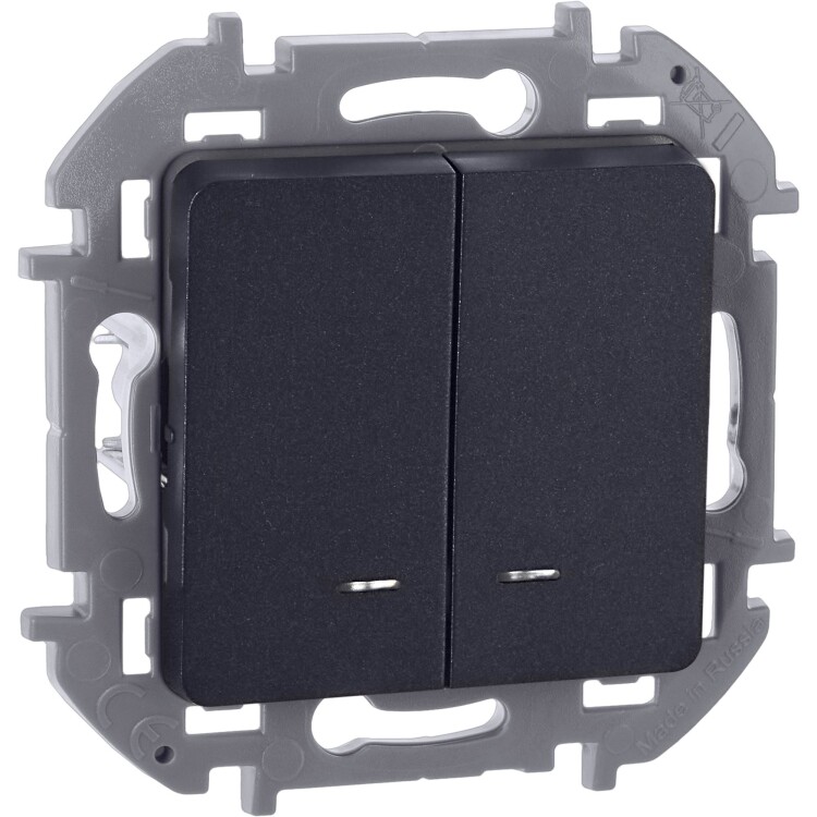 Выключатель двухклавишный с подсветкой/индикацией скрытого монтажа Inspiria, цвет "Антрацит", номинальный ток 10АХ, напряжение ~250В, безвинтовые зажимы. Устанавливается в жилых и общественных помещениях для управления приборами освещения, вентиляции и т.д. Предназначен для управления двумя электрическими цепями.