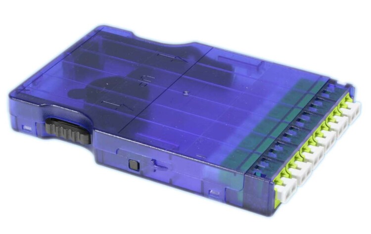 Hyperline PPTR-CSS-1-6xDLC-SM/GN-BL Корпус кассеты для оптических претерминированных решений, 6 дуплексных портов LC/APC, ввод кабеля, возможна установка проходного адаптера MPO, для одномодового кабеля, синий корпус/зеленые порты