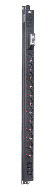 Вертикальный комбинированный блок распределения питания PDU ITK включает в себя розетки двух типов: 6 розеток Schuko и 12 розеток C13 – что позволяет подключать с их помощью различное оборудование. PDU ITK изготавливается из высококачественных термостойких материалов и пластмасс, оснащается 2,6 метровым кабелем электропитания с вилкой Schuko. PDU ITK прекрасно справляется с задачей по электроснабжению сетевого оборудования в шкафах и стойках, а также с требованием защиты от токов короткого замыкания и перенапряжения. PDU ITK соответствует российским и международным стандартам качества и устанавливается с помощью кронштейнов, при этом положение кронштейнов можно менять, либо безынструментальным методом при помощи монтажных штифтов.