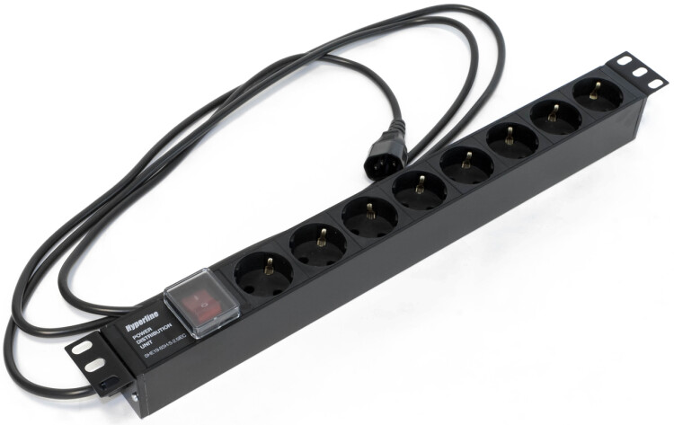 Hyperline SHE19-8SH-S-2.5IEC Блок розеток для 19" шкафов, горизонтальный, 8 розеток Schuko, выключатель с подсветкой, кабель питания 2.5м (3х1.0мм2) с вилкой IEC320 C14 10A, 250В, 482.6x44.4x44.4мм (ШхГхВ), корпус алюминий, черный
