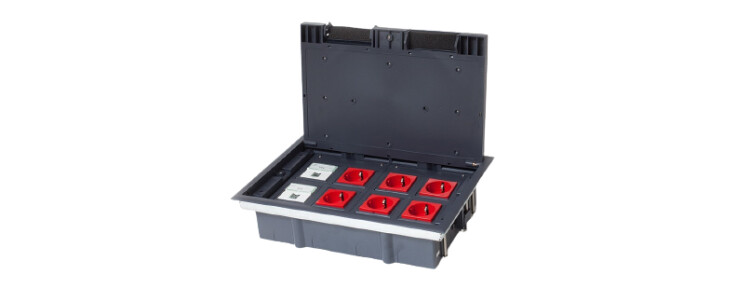 Организация рабочих мест в помещениях с открытым пространством. Возможен монтаж, как в любые типы полов, так и непосредственно в рабочие столы. Особенности: АБС пластик с усиленной металлической рамой Съемная крышка с углублением 8 мм для напольного покрытия Фиксация двух отверстий для вывода кабеля Наличие боковых креплений для фиксации лючка в столе/фальш-поле Горизонтальное расположение суппортов с регулировкой угла наклона розеток до 45° Размеры: Верхняя панель: 328 х 230,5 мм Металлическая рама: 312 х 215 х 19 мм Пластиковая коробка: 279,5 х 201,5 х 55-90 мм Комплект (в сборе) состоит из: Верхняя панель Пластиковая коробка Два суппорта на 4 поста Элементы крепления верхней панели к пластиковой коробке Нет в комплекте: Электроустановочные изделия