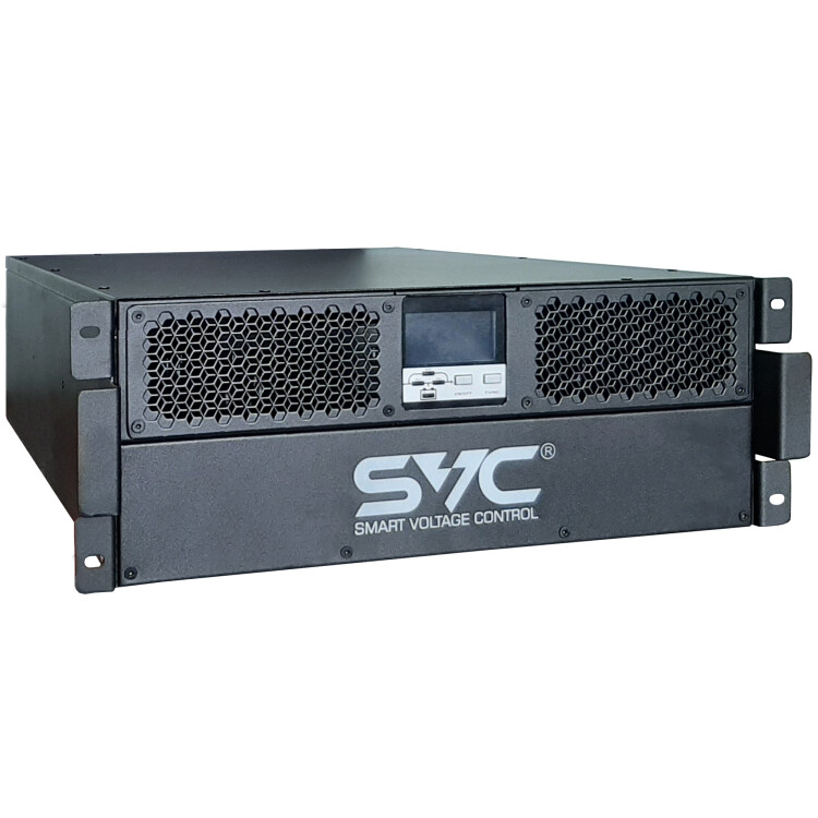 Онлайн ИБП SVC RT-6KL-LCD/R4. Производится в России. Используется для защиты питания файловых серверов и АТС, а также любого другого оборудования, предъявляющего повышенные требования к качеству сетевого электропитания. Принцип работы состоит в двойном преобразовании (double conversion) тока. Сначала входное переменное напряжение преобразуется в постоянное, затем обратно в переменное напряжение с помощью обратного преобразователя (инвертора). При потере питания в городской сети, время переключения в автономный режим равно нулю.