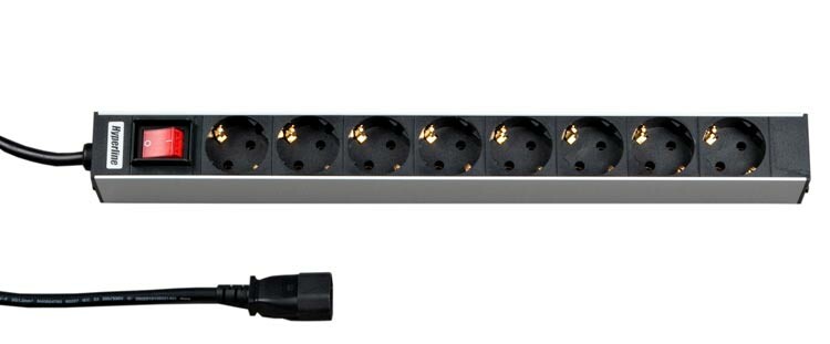 Hyperline SHT19-8SH-S-2.5IEC Блок розеток для 19" шкафов, горизонтальный, 8 розеток Schuko, выключатель с подсветкой, кабель питания 2.5м (3х1.0мм2) с вилкой IEC320 C14 10A, 250В, 482.6x44.4x44.4мм (ШхГхВ), корпус алюминий