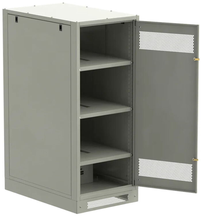 Шкаф аккумуляторный серии LINEA B предназначен для размещения и защиты от несанкционированного доступа аккумуляторных батарей (АБ). Шкафы LINEA B повышенной прочности со сварным каркасом и усиленными полками позволяют размещать АБ до 500 кг. на полке. Вместе со шкафом поставляются полки. Количество полок в комплекте зависит от высоты шкафа. Каркас позволяет размещать полки с шагом 30мм. В полках предусмотрены вырезы для удобства соединения АБ. В нижней части корпуса предусмотрена плата для установки предохранителя-выключателя-разъединителя ПВР. Шкаф аккумуляторный серии LINEA B односекционный поставляется на цоколе высотой 100мм. Все металлические части шкафа LINEA B заземлены. В комплект включены РЫМ-болты для удобства перемещения шкафа. Вентиляционные отверстия в дверях и задней панели обеспечивают циркуляцию воздуха.